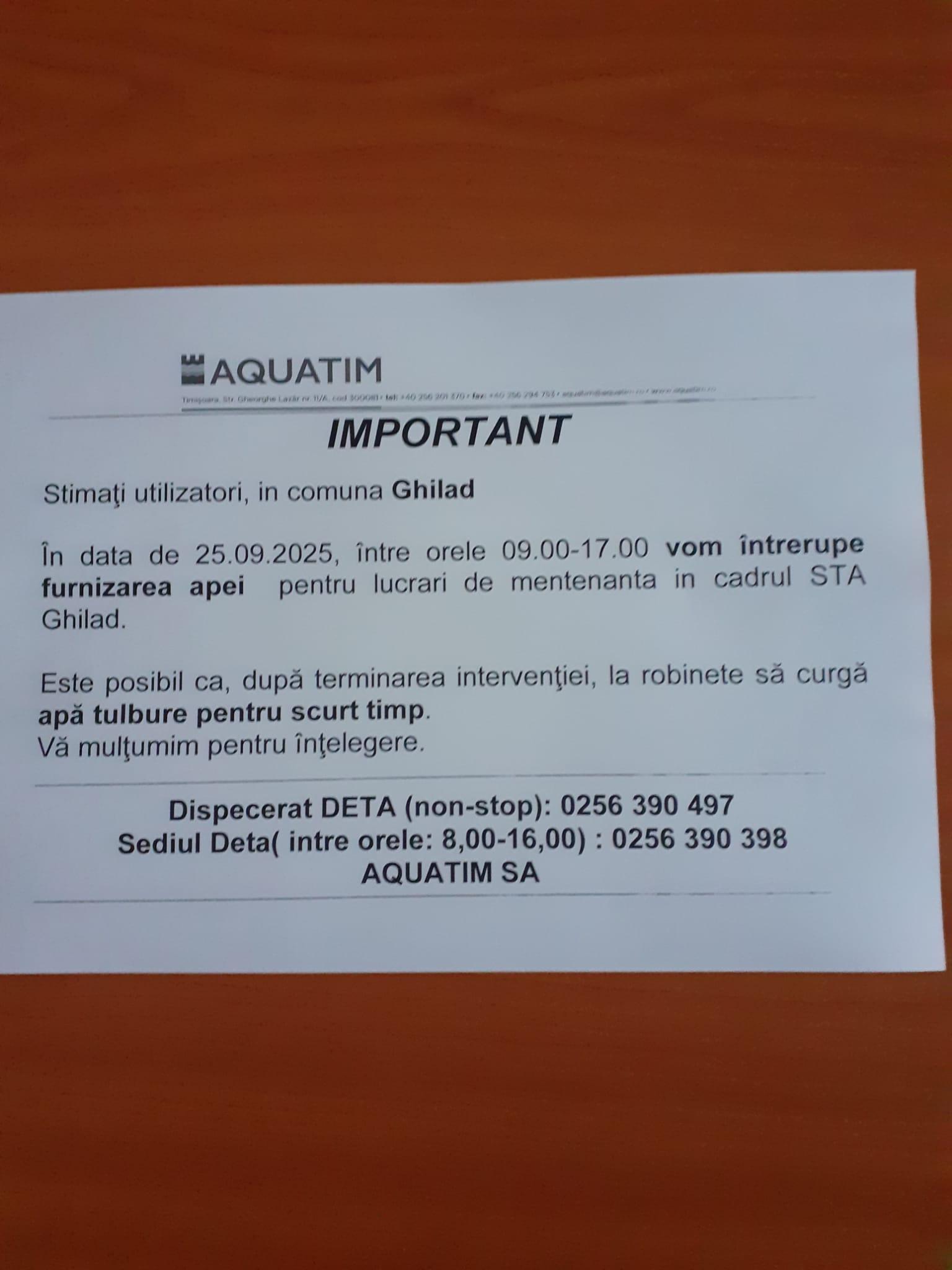 Vă anunțăm că joi, 25 septembrie, între orele 9-17 se va întrerupe furnizarea apei în Ghilad pentru lucrări de mentenanță la Stația de Tratare a Apei din localitate.